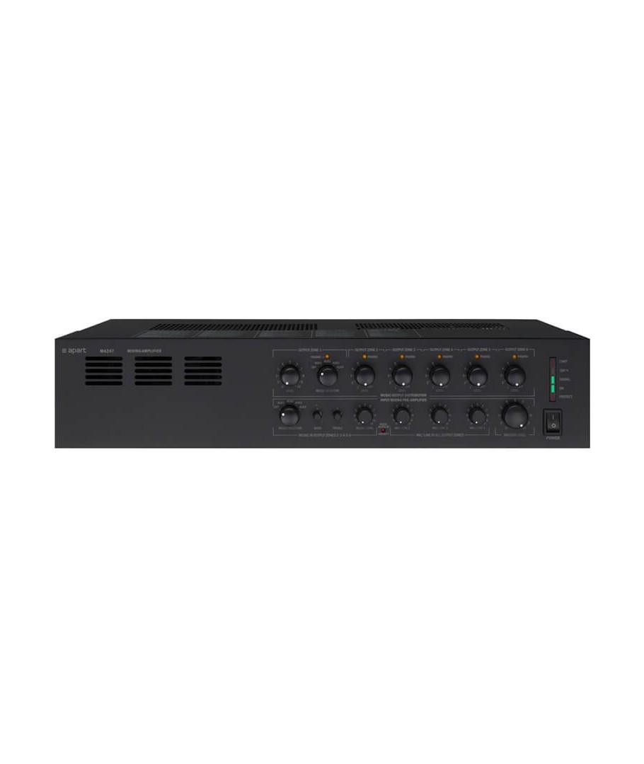 El MA247 dispone de cuatro entradas balanceadas a través de conector Euroblock. La entrada de micrófono 1 está optimizada para ser utilizada con el MICPAT-6 de Apart, un micrófono para megafonía con capacidad de selección entre 6 zonas, y que ha sido diseñado especialmente para trabajar con el MA247. Este micrófono actúa como principal, permitiendo la conmutación en paralelo sobre esta entrada de hasta 5 micrófonos de este tipo.