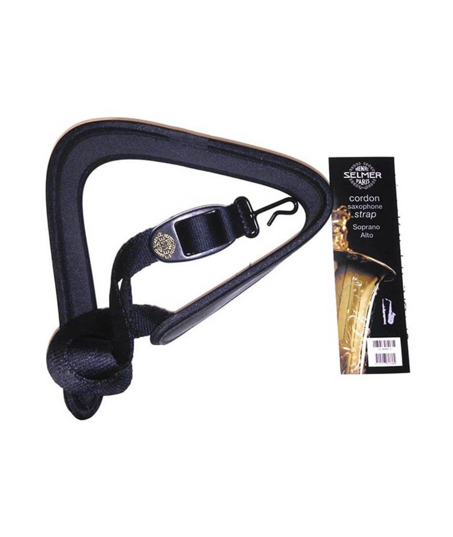 CORDÓN SAXO ALTO Y SOPRANO SELMER. Cordón Selmer original, para saxo alto o soprano. Acolchado especial en la parte del cuello, ajuste de altura y gancho metálico.