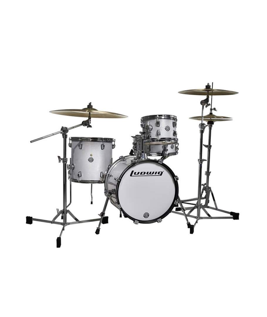 Batería Junior Ludwig LC179XX Breakbeats White Sparkle. Diseñada pensando en la ciudad. Esta batería portátil es una solución vital para el batería urbano y ha sido creada grancias al gran batería y productor Ahmir “Questlove” Thompson, dejando su huella en este set compacto con mucho groove aún tocando en sitios pequeños.
