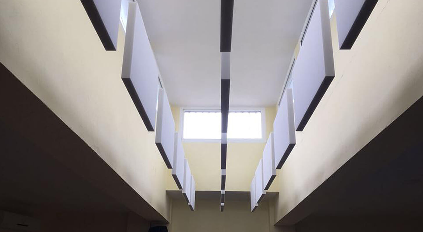 Nuevo trabajo de Acondicionamiento Acustico en la Escuela de Música de El Ronquillo en Sevilla. En este caso hemos instalados unos paneles acústicos de 120x60, acabados en tela acústica de la marca Vicoustic y difusores para techo Kontour. Para la zona central paneles acústicos en techo, a modo de bafle suspendido con tirantes de acero mejorando de una manera sorprendente el confort acústico en el local. Resultado fantástico.