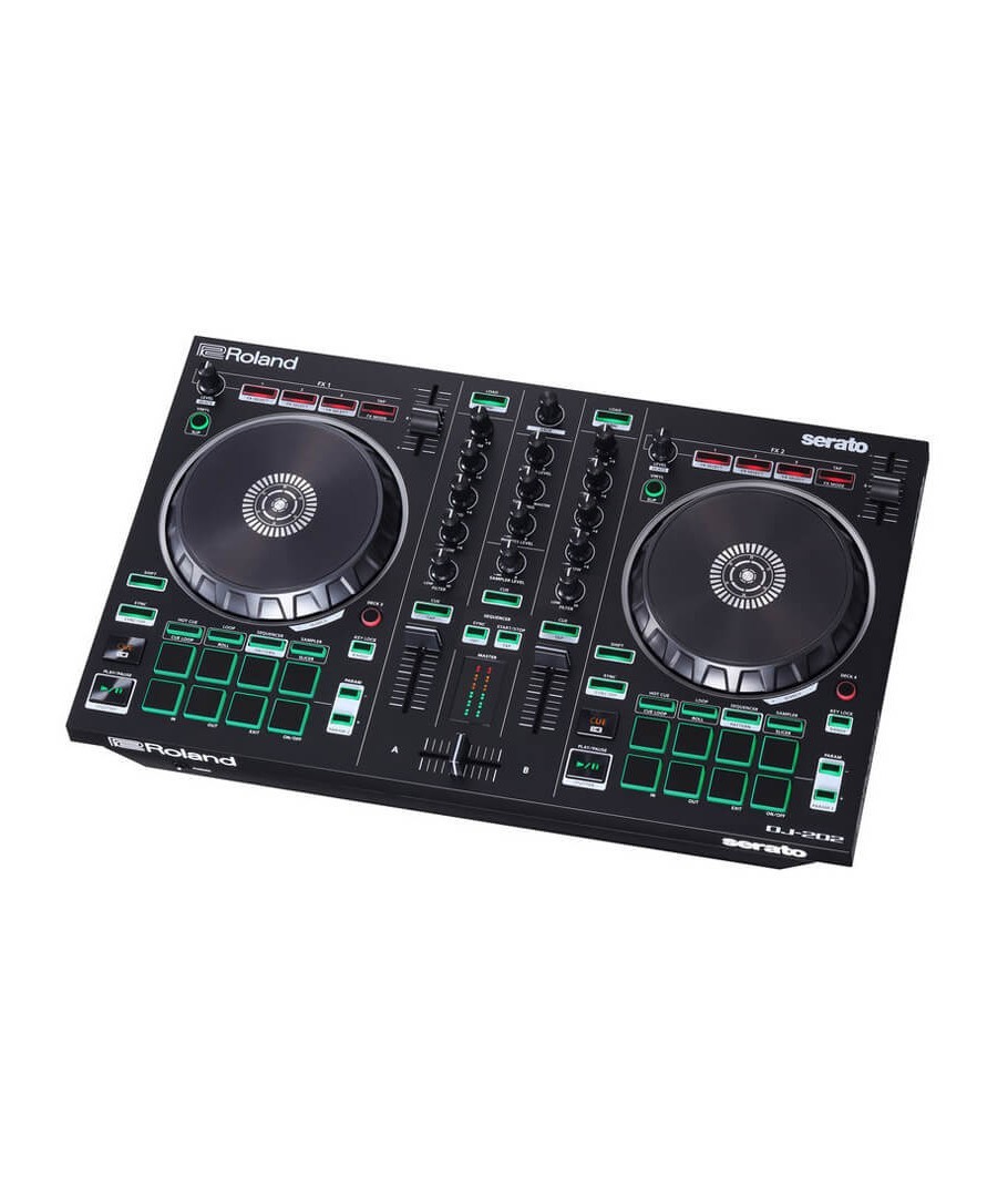 ROLAND DJ-202. Vanguardista controlador para Serato DJ Lite, le Brinda a los DJs las características y el alojamiento de funciones encontradas en el controlador profesional de tamaño completo; todo eso en una regia unidad portable.