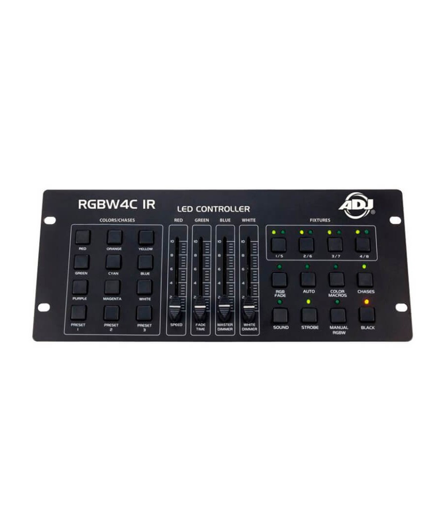 AMERICAN DJ RGBW 4C IR. Controlador LED de 32 canales RGB, RGBW o RGBA. Ha sido diseñado para controlar cualquier grupo de dispositivos LED de 3 o 4 canales estándar donde el canal 1 es rojo, el canal 2 es verde, el canal 3 es azul y el canal 4 es blanco o ámbar. Hasta 8 dispositivos LED o grupos de aparatos pueden ser controlados de forma independiente a través de los cuatro botones del accesorio.