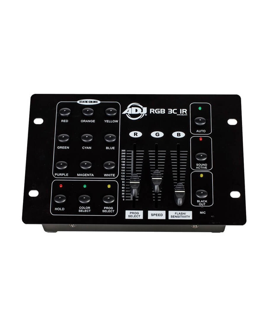 El panel de control del RGB 3C IR  incluye nueve botones de acceso directo "Color estático", que contienen preajustes de color pre-programados, 3 faders RGB manuales para ajustar el color deseado sobre la marcha, un botón de selección de programas que permite 7 colores estáticos y 10 programas de seguimiento al cual se accede a través del programa de selección de fader, un botón para activar por sonido que activa los 10 programas de seguimiento para secuenciar al azar a través de un micrófono interno, un botón Auto run que también activa los 10 programas de seguimiento 10 al azar, mientras que la velocidad de las persecuciones se puede controlar mediante el fader de velocidad.