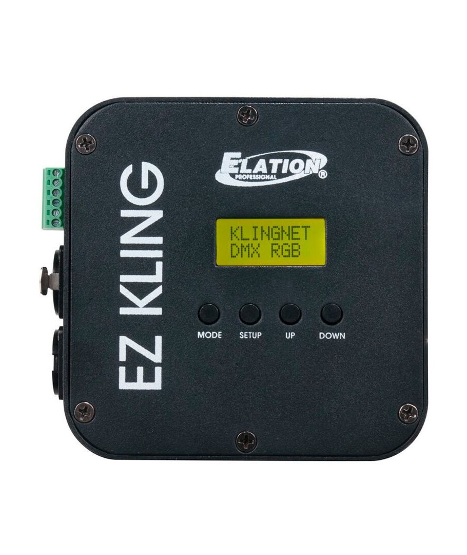 AMERICAN DJ EZ KLING. Las pantallas de baja resolución pueden mejorar seriamente su producción. Estas pantallas están compuestas por varias barras de píxeles o pantallas que funcionan como una sola unidad. Para controlar esta unidad, necesitará una interfaz como esta EZ-Kling de American DJ que convierta KlingNet a DMX-512. El EZ Kling puede controlar hasta 600 píxeles simultáneamente, para crear pantallas de baja resolución fácilmente.