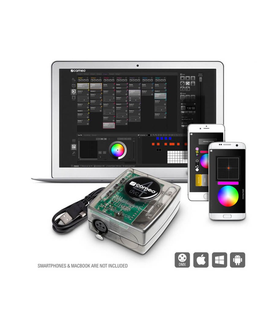 CAMEO DVC 4 INTERFAZ DMX DE 512 CANALES Y SOFTWARE DE CONTROL La interfaz DVC 4 de Cameo permite controlar cualquier equipo de iluminación compatible con DMX desde un ordenador y macen el que esté instalado el software D 4 dedicado de Cameo.