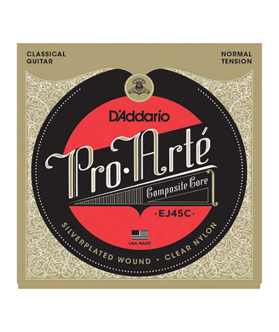 Juego de Cuerdas Guitarra Clásica "Pro Arte" EJ45C Tensión Normal. Las cuerdas Pro-Arte Composite se construyen con un multi-filamento exclusivo en el núcleo lo que mejora la vida y consistencia de las cuerdas. Como todas las cuerdas Pro-Arte, los juegos son clasificados por una máquina láser muy sofisticada controlada por ordenador que realiza medidas de diámetro/tensión y control de calidad para asegurar la entonación perfecta. Los juegos Composite desarrollan una proyección adicional. La tercera cuerda proporciona más flexibilidad tonal y una transición de volumen equilibrada entre graves y agudos. Las cuerdas, ligeramente pulidas, reducen el ruido de dedo notablemente, haciéndolas ideales para grabación.