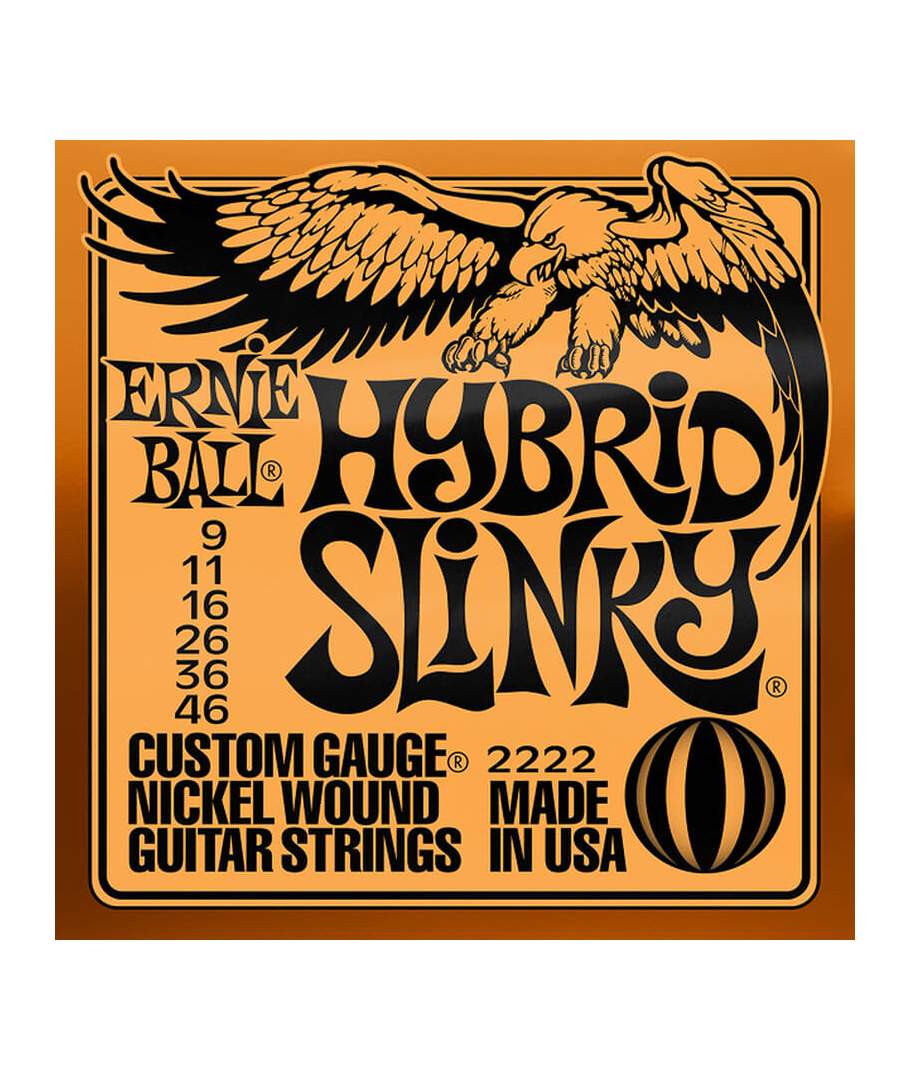 Juego Cuerdas Guitarra Eléctrica Ernie Ball 2222 Hybrid Slinky. Este juego híbrido es el set perfecto para aquellos que gustan de la excelente capacidad combinativa de las cuerdas primas de las Super Slinky con las cuerdas graves de las Regular Slinky. Están fabricadas bajo los más estrictos controles para garantizar la máxima consistencia y una mayor duración. Presentan un entorchado de niquel sobre un hilo de núcleo hexagonal, mientras que las cuerdas planas están fabricadas con una aleación de acero y carbono para proporcionar un tono preciso y balanceado.
