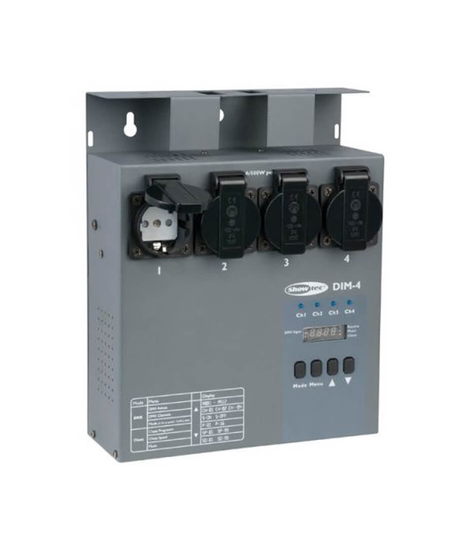SHOWTEC DIM-4. El DIM-4 es un dímer compacto y potente. Cuenta con 4 canales que se pueden cargar cada uno con hasta 3A. Con un consumo total de energía de 8A, este dímer puede adaptarse a todo tipo de tomas.
