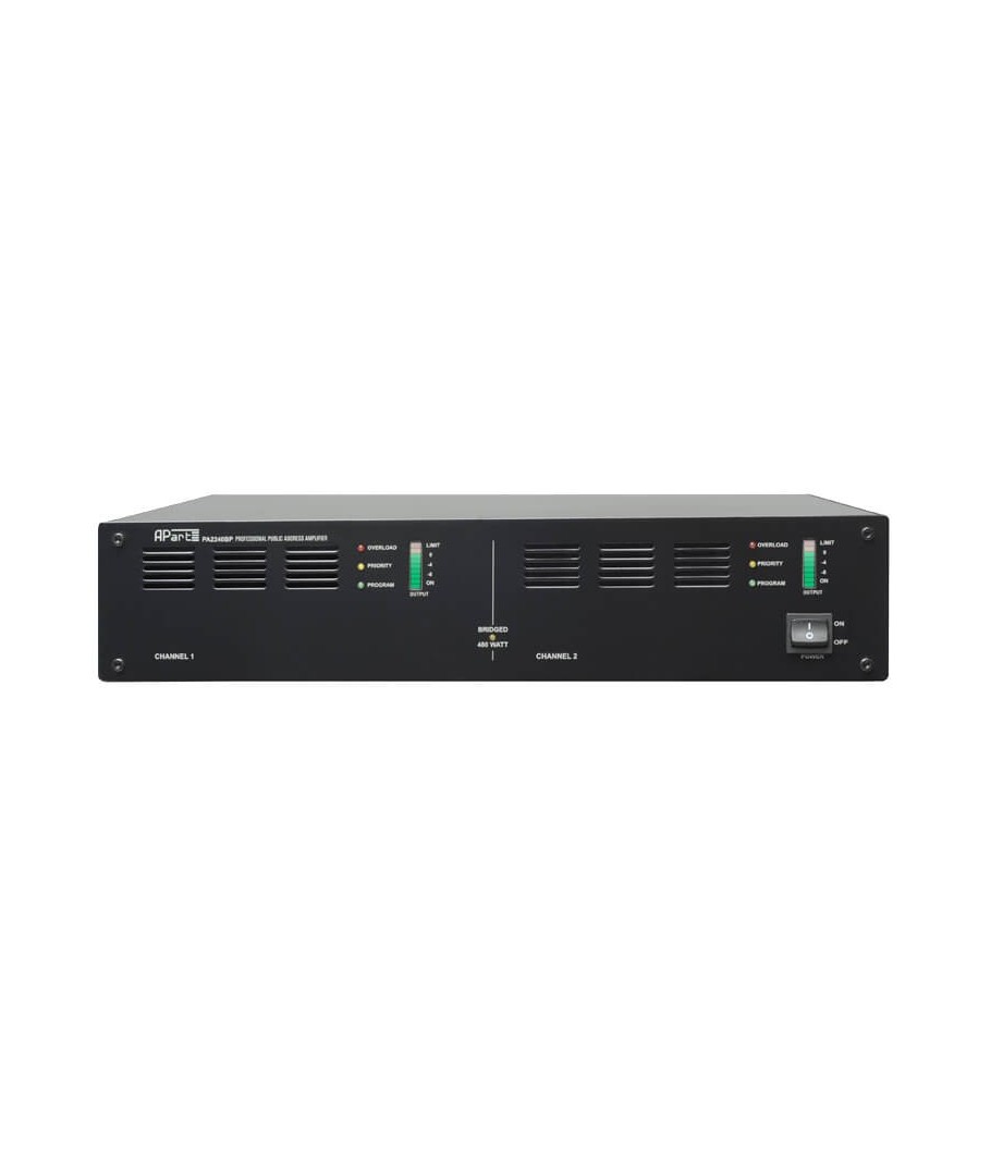 APART PA-2240BP. Amplificador de 2 canales para líneas de 100 V, que ofrece una potencia de 2x240 W, configurable en modo puente para obtener 1 x 480 W.