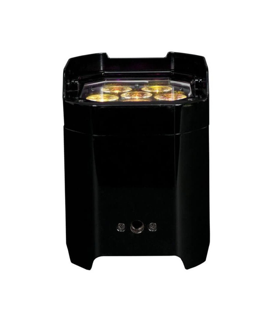 AMERICAN DJ ELEMENT QAIP. Foco LED con batería, con protección IP54 y DMX inalámbrico WiFLY EXR de ADJ para uso en interiores o exteriores. Va provisto de seis LED RGBA (4 en 1) de 5 W. Los aparatos de la serie Element Par son ligeros y fáciles de manejar, con un asa de transporte y pie para iluminación indirecta, para escenario, eventos, producciones y cualquier aplicación móvil. ¡No se necesitan cables de ninguna clase!