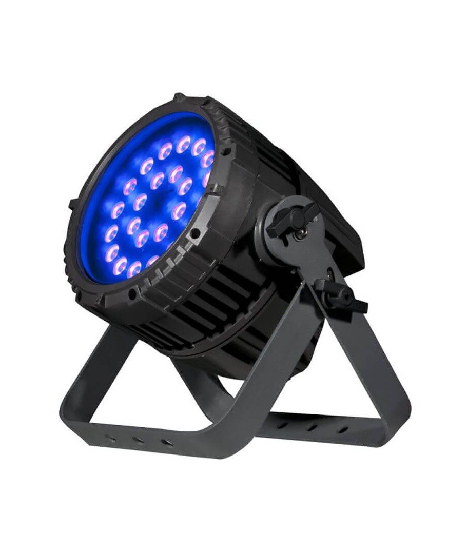 AMERICAN DJ UV 72IP. Produce una luz ultravioleta de alta densidad diseñada para actuaciones en escenarios al aire libre, funciones teatrales y producciones de efectos especiales. Este dispositivo profesional, totalmente de metal, con protección IP65 para exteriores, incorpora DMX inalámbrico WiFLY EXR de ADJ y funciona con 3 LED UV de 3 W.