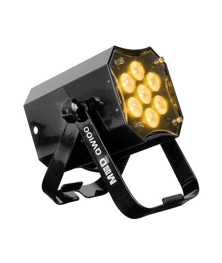 AMERICAN DJ MOD QW100. Los reflectores LED de la serie Modular de iluminación de ADJ dotan a los diseñadores de más flexibilidad funcional, además de más posibilidades para crear grandiosos baños de luz para escenarios, instalaciones o actos en giras. Los reflectores Mod son «modulares» de dos maneras. Primero, el cuerpo se mueve de forma que es posible crear un snoot para eliminar el resplandor lateral si así se desea.  Segundo, los diseñadores pueden retirar la carcasa negra de metal y sustituirla con un kit de carcasa de color blanco perla. Así, es posible cambiar entre aparatos blancos o negros dependiendo de la instalación, sin que sea necesario disponer de dos aparatos distintos.