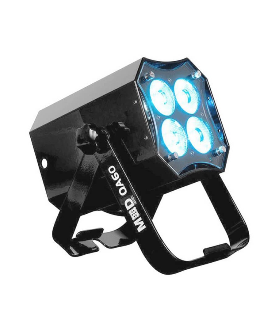 AMERICAN DJ MOD QA60. El MOD QA60 viene equipado con cuatro diodos LED RGBA (4 en 1) de 15 W (para una potencia total de 60 W), un yugo de tijera y tres filtros difusores intercambiables que se desmontan fácilmente con tornillos de ajuste manual. El haz estándar de 17 grados se puede cambiar sobre la marcha a 20, 40 0 60 grados.