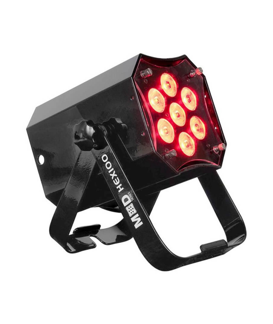 AMERICAN DJ MOD HEX100. El MOD HEX100 viene equipado con siete diodos LED RGBWA+UV (6 en 1) de 15 W (para una potencia total de 105 W), un yugo de tijera y tres filtros difusores intercambiables que se desmontan fácilmente con tornillos de ajuste manual.