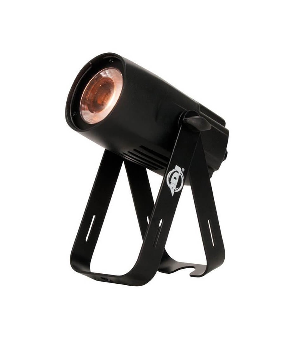 AMERICAN DJ SABER SPOT DTW. Pinspot de 15W Quad LED, con blanco calido y ambar, 3100K 1900K y cuenta con DMX-512, operación sin parpadeo, estroboscópico, oscurecimiento electrónico y tiene un 4 -Botón DMX sistema de visualización en el panel posterior.