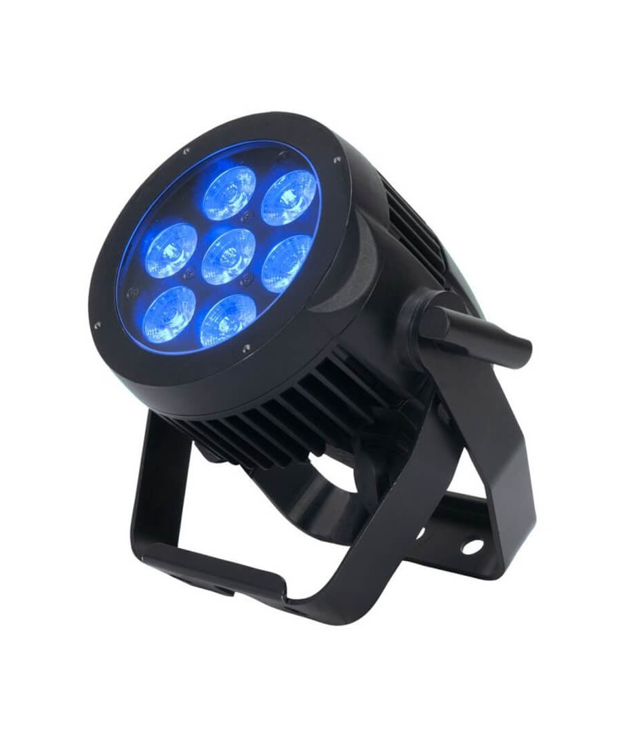 AMERICAN DJ 7P HEX IP. Versátil IP65 para exteriores con 7 x 12-Watt (6-IN-1 HEX) LEDs. Con un ángulo de haz de 30 grados, los usuarios pueden producir lavados anchos con una mezcla suave de colores a partir de 63 macros de color incorporadas que utilizan LED rojos, verdes, azules, ámbar, blancos y UV. Este LED Par no sólo es ideal para la iluminación de escenarios y lugares de interior, sino que con una clasificación IP 65, es una gran solución para la iluminación exterior temporal de escenarios o eventos. La clasificación IP 65 ayuda a proteger el aparato de la lluvia, la nieve y el polvo.
