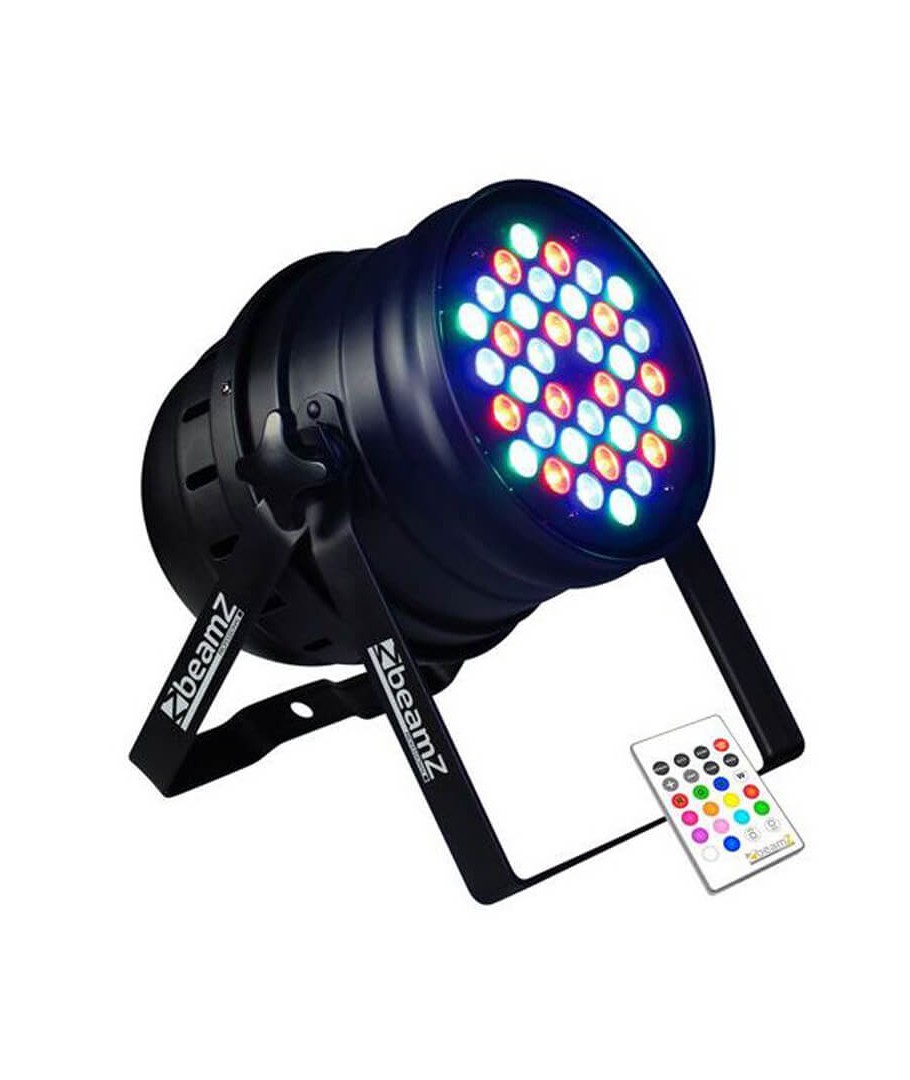 BEAMZ PRO 151234. Efecto de luz controlado por 7 canales DMX con Leds 36x3W Quad en carcasa de foco PAR 64 can. Gracias a los leds de 3W permiten la creación de un intenso baño de color. Equipado con efectos preprogramados y mando a distancia por infrarrojos para fácil control.