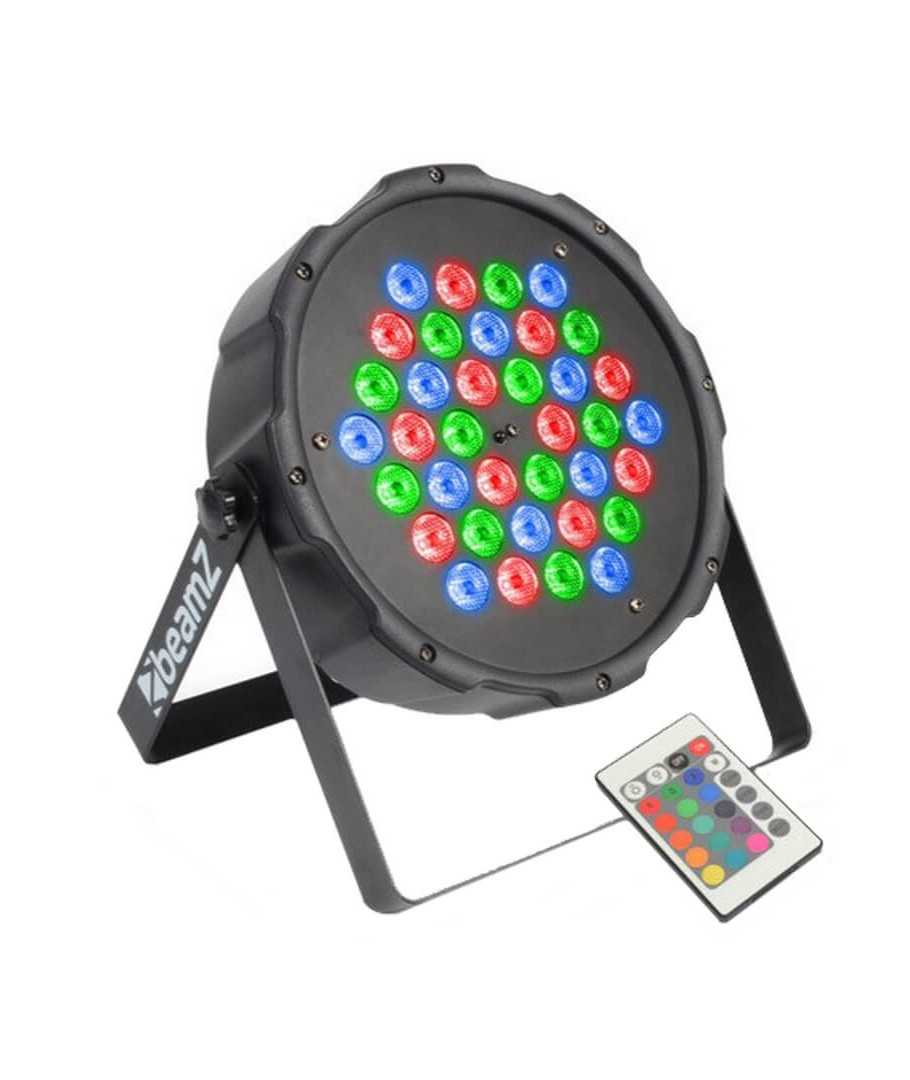 BEAMZ 151290. Este foco PAR plano incorpora 36 Leds RGB 1W en una carcasa compacta. Ofrece una gran cantidad de colores estaticos y mezclados para generar preciosos efectos.