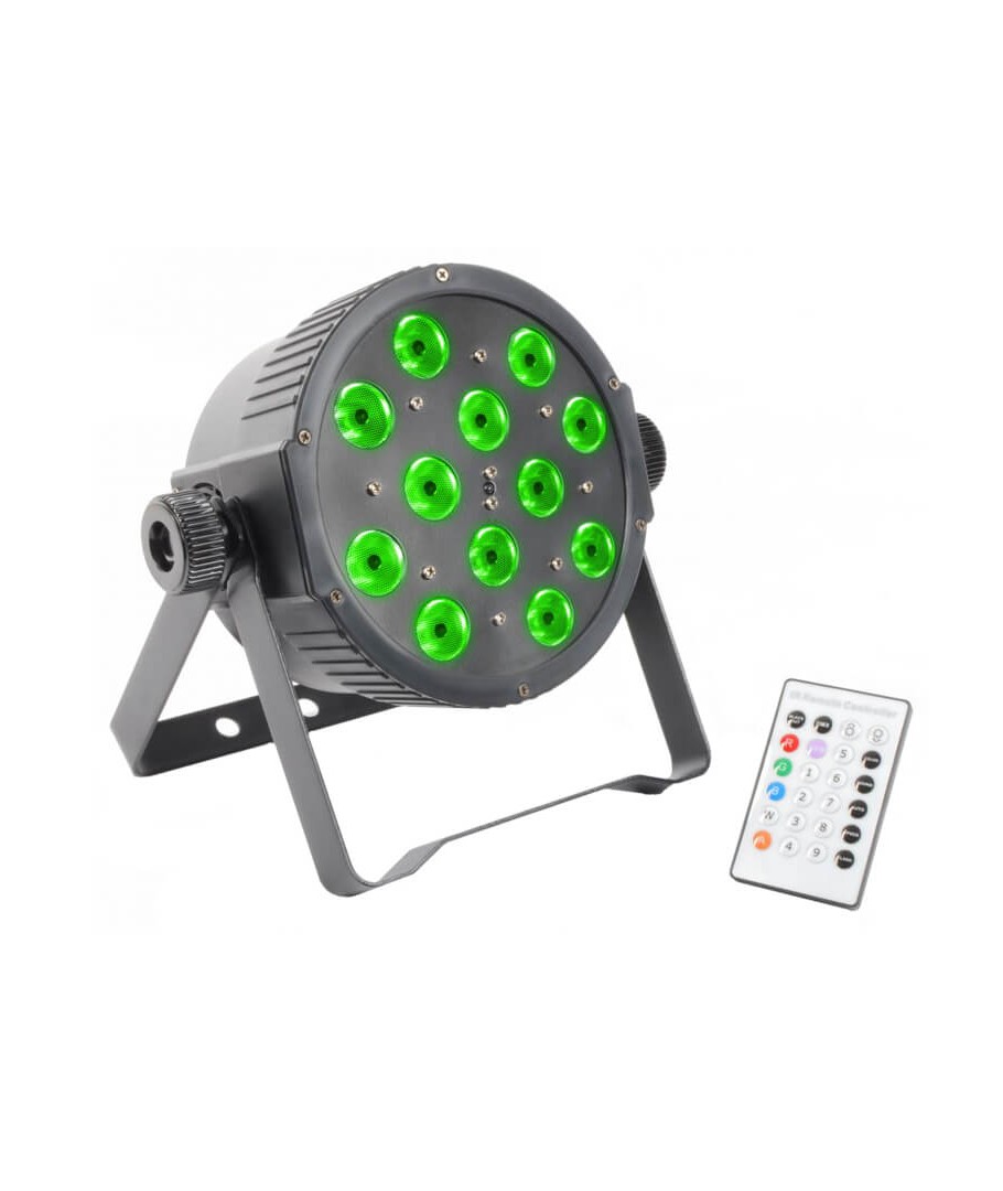 BEAMZ 151273. Potente foco PAR Tri-color LEDs de 12x 3W en carcasa ligera y estrecha con alta luminosidad y perfecta mezcla de color. Esta unidad puede operar en modo Auto, DMX, master/esclavo. Incorpora mando a distancia IR, strobing, fading, flash, dimming y varios programas control por musica internos o ... puedes crear tu propio espectaculo controlando por DMX 7 canales.