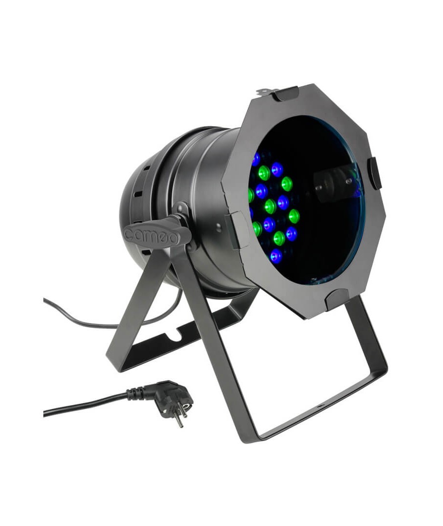 CAMEO CAN RGB 3W BS. Foco PAR LED RGB 36 x 3 W con carcasa negra. Potente foco PAR de LEDs con una carcasa corta de color negro. Incluye un soporte doble para apoyar en el suelo y un portafiltros.
