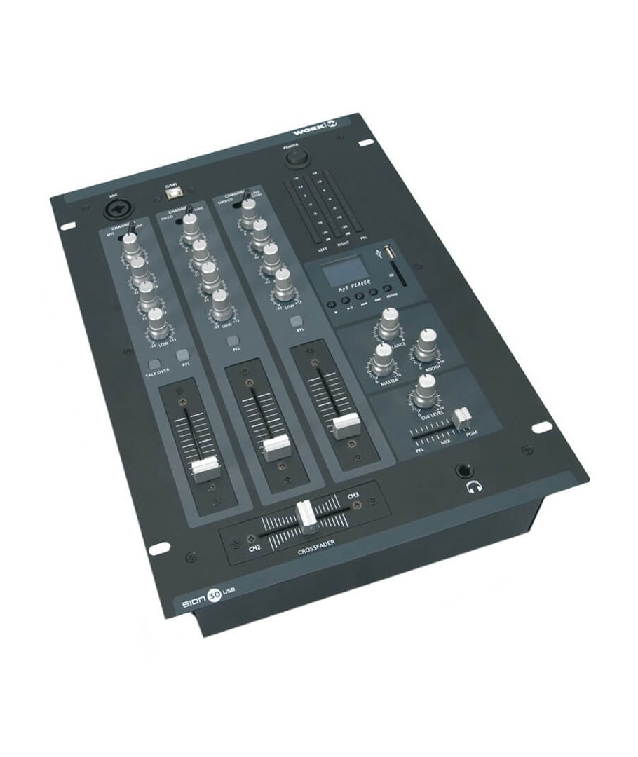WORK SION 30 USB. Consta de una interfaz USB FULL DUPLEX MP3 (reproducción/grabación). Permite conectar dispositivos portátiles en su puerto USB o mediante tarjeta SD. Los ficheros MP3 son visualizados en pantalla, pudiendo navegar entre carpetas y realizar una programación de las pistas. Su puerto USB FULL DUPLEX emula un codec en el ordenador que permite: - la ejecución de ficheros MP3 desde el ordenador - la grabación de la propia sesión con el software adecuado. En el apartado de control y mezcla, incluye 3 canales con selector de fuente de entrada. Uno de los canales puede utilizarse como DJ MIC con función TALKOVER. Incorpora también una función CROSSFADER entre las entradas. Incluye salida balanceada y desbalanceada, además de otra adicional con control individual. Todas las entradas disponen de función PFL y control de monitorizado para la toma de auriculares.