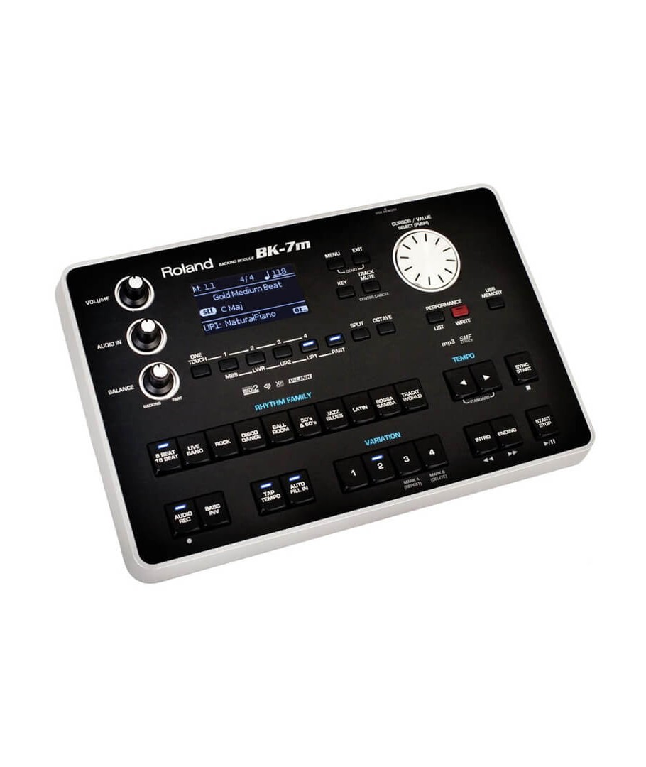 ROLAND BK-7M. Añade una banda de acompañamiento de clase mundial a tu espectáculo con el nuevo BK-7m, un modulo que contiene una banda interactiva en un paquete compacto. Más pequeño que un libro, el BK-7m es una máquina de ensueño para el artista del entretenimiento o músicos solistas que necesitan una banda de acompañamiento en el escenario, en el estudio, o en casa. Con centenares de grandes sonidos, estilos musicales, y ritmos incorporados – todos accesibles de forma rápida pulsando un botón – el BK-7m te hará sonar como una banda profesional en el escenario. Elige entre la librería de estilos incorporada o toca tus ficheros de música directamente desde el USB para acompañarte. Incluso podrás grabar tus actuaciones directamente a una memoria USB para distribuirla o guardarla.