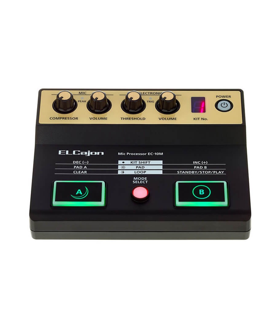 ROLAND EC-10M. El procesador de micro para El Cajón EC-10M es una herramienta creativa absolutamente única e innovadora diseñada para el cajón acústico. Compacto y con alimentación a pilas, el EC-10M capta el sonido acústico del cajón con el micrófono de condensador de pinza, que también se utiliza para disparar diversos sonidos integrados, que se añaden a la voz acústica. Puedes enviar ambas señales a un amplificador o sistema de PA para tener control total sobre tu sonido en el escenario. También se pueden crear frases de percusión con un looper integrado y añadir otros sonidos mediante los pads de pie A/B integrados o con pedales disparadores de bombo opcionales. Allá donde toques, el EC-10M transforma la experiencia del cajón acústico con todo un mundo de nuevas posibilidades expresivas.