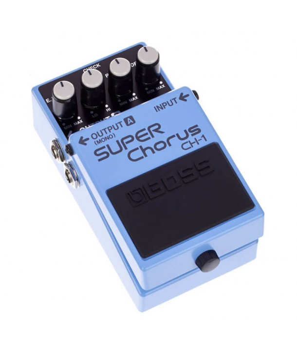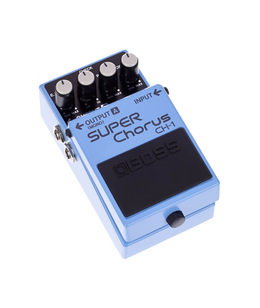 BOSS CH-1. Pedal compacto que entrerga un sonido de chorus claro con resolucion en frecuencias altas realmente nítido y un efecto estéreo único, variable entre los altavoces izquierdo y derecho. Una función EQ ajusta la tonalidad del sonido de chorus.