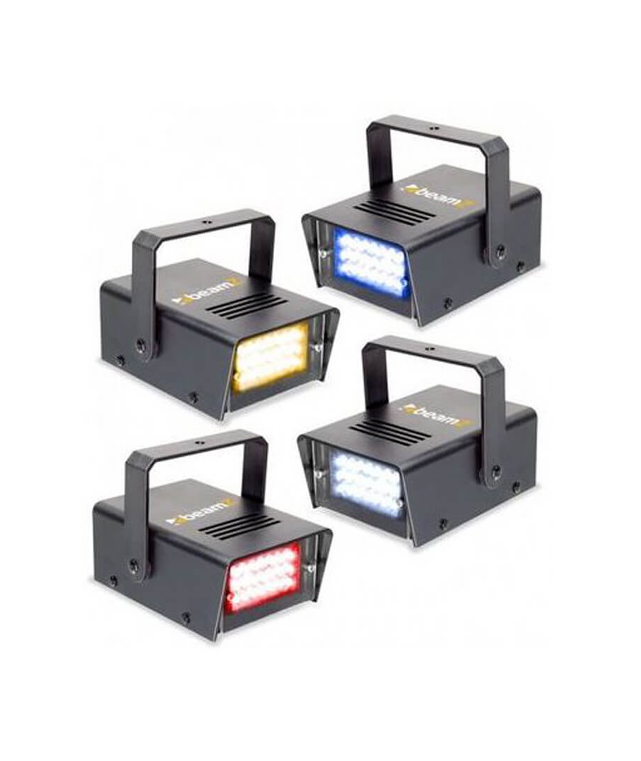 BEAMZ CONJUNTO DE 4 MINI LED STROBO RYBW 153325. Conjunto de 4 mini strobos LED con 24 x 5mm LEDs por unidad. Cada strobo produce un color; rojo, amarillo, azul y blanco. El resultado es un efecto espectacular. Incorpora funcion auto.