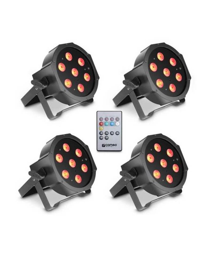 CAMEO SET DE 4 FOCOS PAR LED 5x3W TRICOLORES RGB PLANOS NEGRO. Set de 4 Focos PAR LED tricolores RGB planos 7x3W de alta potencia con Carcasa negra y Mando a distancia de infrarrojos.