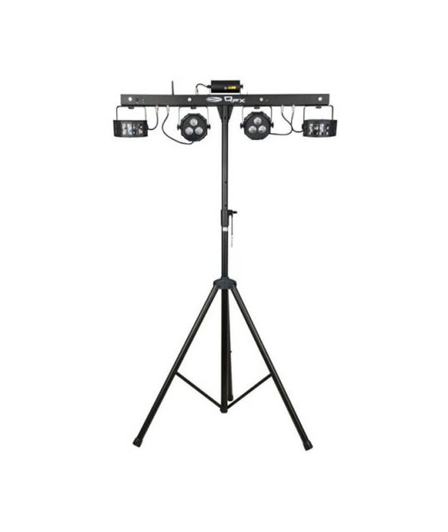 El foco LED y el efecto Derby disponen de colores RGB que se pueden seleccionar individualmente o en combinaciones preprogramadas. Se entrega un sistema completo que incluye un trípode, un interruptor de pie inalámbrico, un mando a distancia por infrarrojos y bolsas para proteger el juego durante el transporte. La barra controladora QFX ofrece sensacionales programas automáticos incorporados y activados por sonido en los que se utilizan los 4 efectos para crear un espectáculo completo.