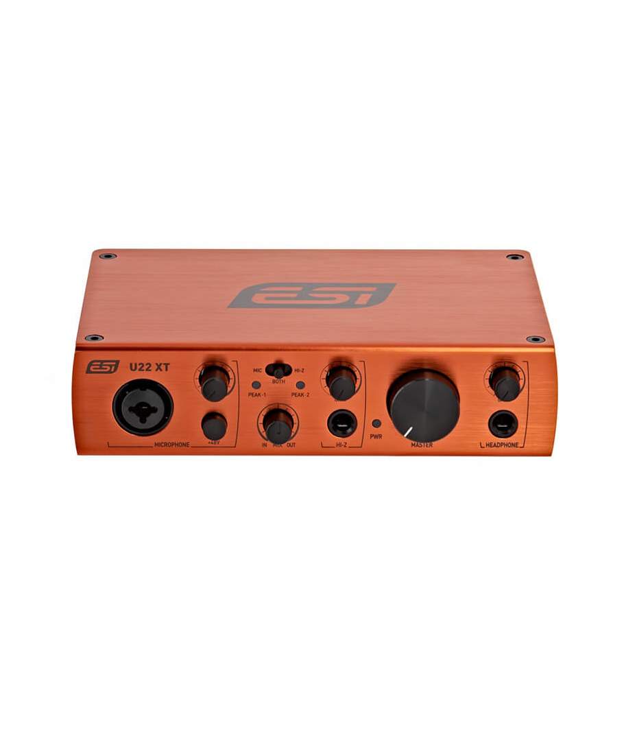 ESI U22 XT. Interfaz digital de 24 bits de calidad profesional que incluye un preamplificador de micrófono con alimentación fantasma de +48v, una entrada de instrumento Hi-z, salida de auriculares y E/S de línea.
