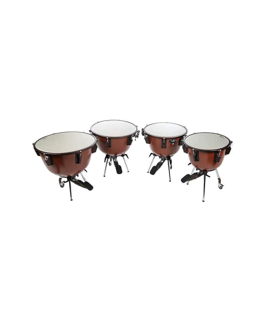 Timbales Bergerault V123F. Los timbales Bergerault "Voyager Series" están especialmente diseñados para la educación y la configuración de orquesta de boxes. Fabricado con un tazón de poliéster, aluminio o cobre reforzado con fibra de vidrio de curvatura profunda , la construcción da como resultado un peso extremadamente ligero y características de rendimiento avanzadas. El diseño del mecanismo del embrague de fricción hace que la acción del pedal sea excepcionalmente ligera y el sistema de resorte de diseño exclusivo asegura una acción suave del pedal en todo el rango de casi una octava.